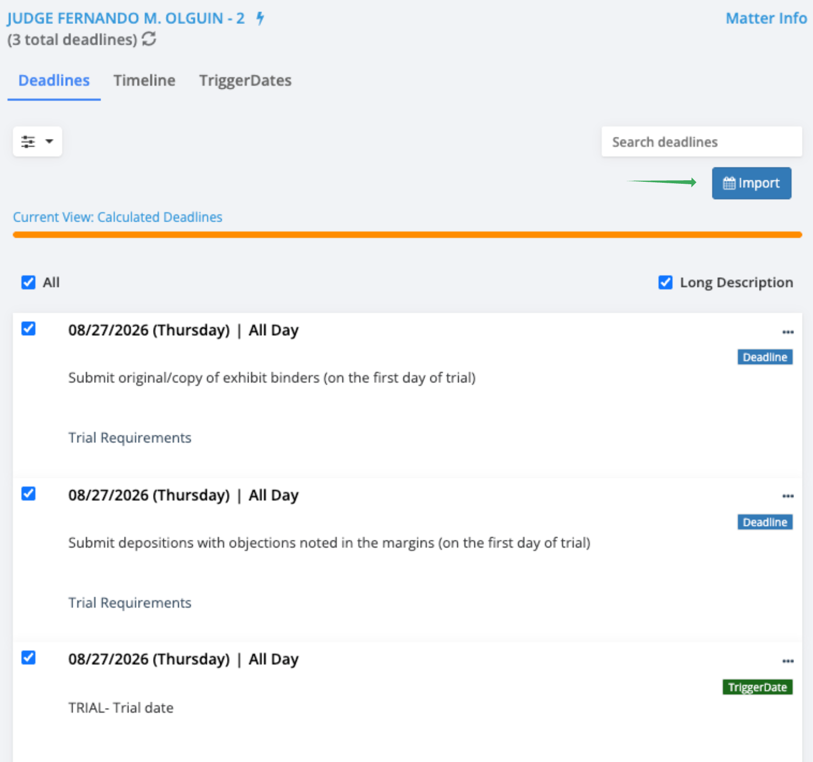 Calculate and “Import” Judge’s deadlines to the main USDC matter