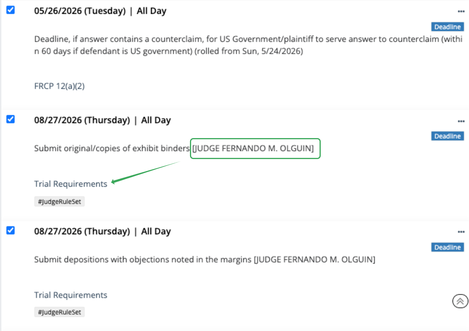 All deadlines will be added with the name of the judge as a suffix and will display with your FRCP deadlines and other events.